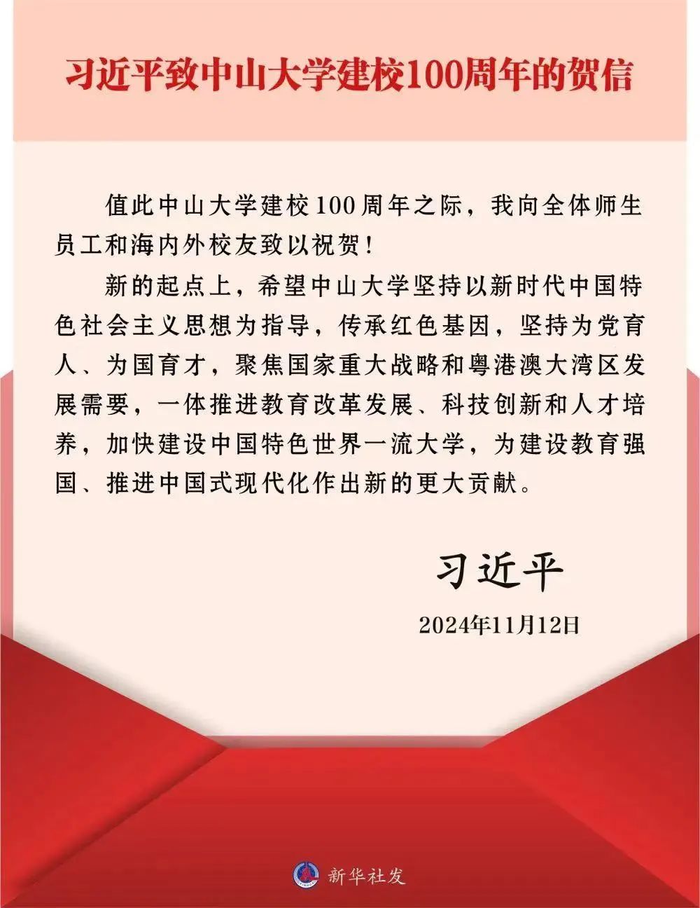 2024年11月12日,在中山大学建校100周年之际,习近平总书记向中山大学全体师生和海内外校友致信。广东省委书记黄坤明出席庆祝孙中山先生创办中山大学100周年大会,宣读习近平总书记重要贺信并讲话。