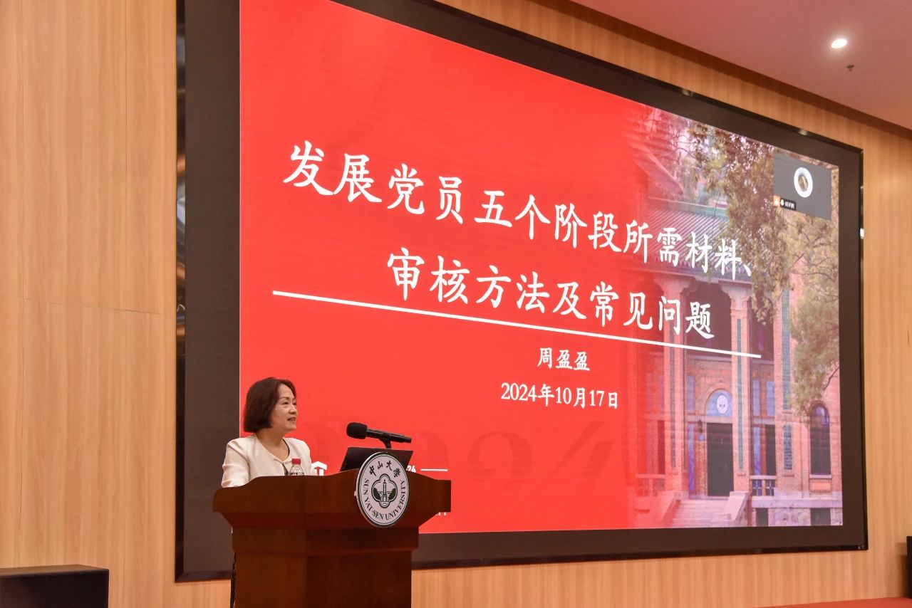 周盈盈同志作题为《发展党员五个阶段所需材料、审核方法及常见问题》辅导报告。主要从党员材料的重要性、党员发展五个阶段所需的材料、材料审核的基本方法,以及入党材料常见的问题四个方面进行细致的讲解。通过将规范条例与实际工作中出现的各类问题相结合,清晰展示了党员材料的审核要点。周盈盈同志强调,党员材料是记录党员政治生涯的材料,需要存入人事档案,是党员身份的标识。党员材料的规范与否,直接关系党员个人政治生涯的发展,同时也影响所在党组织工作质量评估的结果。