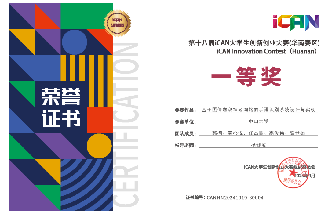 我院郭栩、任杰麟、高俊伟、骆世雄同学与国际金融学院学院黄心悦同学组成的“手语精灵”队,在我院杨健敏副教授的指导下,凭借扎实的创新能力和默契的团队协作,取得了创新赛道华南赛区一等奖、全国总决赛二等奖的好成绩,指导老师杨健敏副教授获华南赛区优秀指导教师奖。