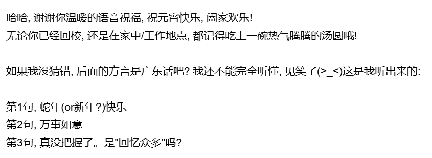 本次活动共收集祝福五十余份,包含文字、图片、声音等多样形式,在此新春佳节,同学们为彼此送上真挚的祝福,同时也收到“秘密”传递给自己的佳声。每一句祝福,都是精心雕琢的音符,汇聚成悠扬动听的乐章。这不仅是一次简单的言语传递,更是同学们情感共鸣的汇聚,是青春活力与美好愿景的交融。