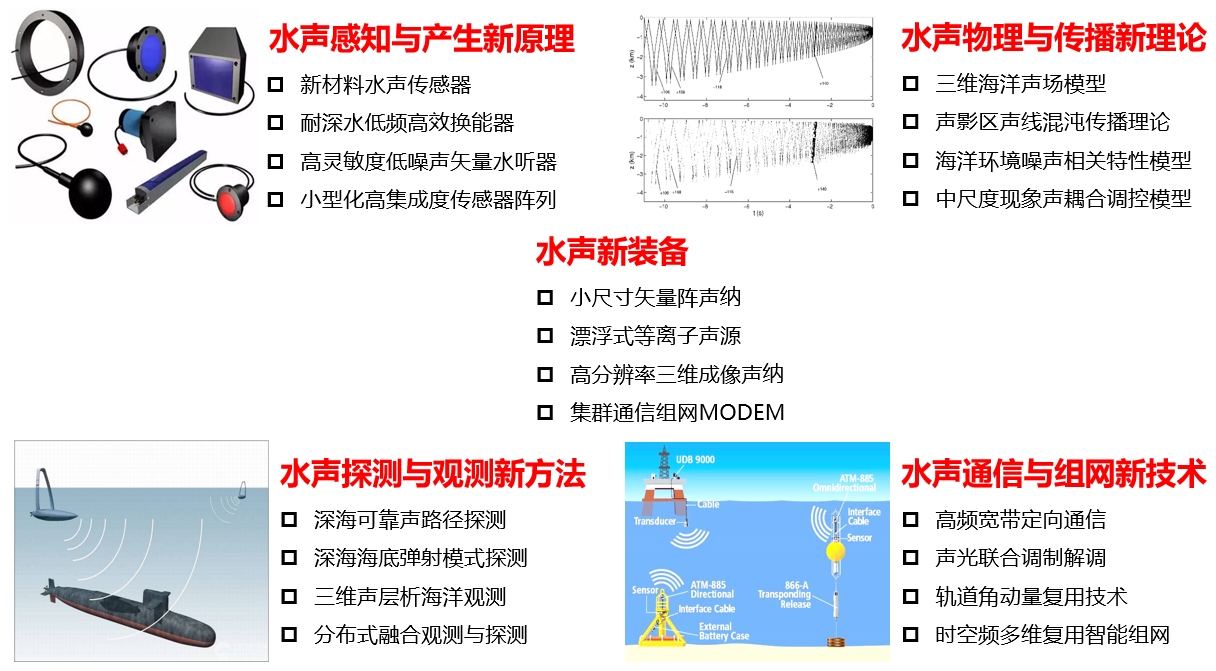 水声信息方向紧密围绕水面水下小平台观测与探测,开展基于新平台、新机理、新方法的微弱目标探测与识别技术研究,同时与集群组网应用相结合,在新兴学科的支撑下,探索新体制水声系统及应用。