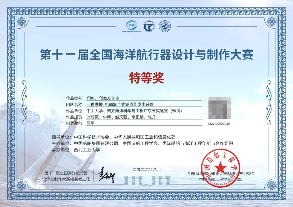 8月13日至14日,第十一届全国海洋航行器设计与制作大赛全国总决赛在西安西北工业大学举行,我院马勇教授带领团队闯入决赛,并参加线上答辩,最终作品《一种摩擦-电磁复合式潮流能发电装置》荣获创新、创意及创业组全国特等奖,创我院学生在此项赛事上的最好成绩。