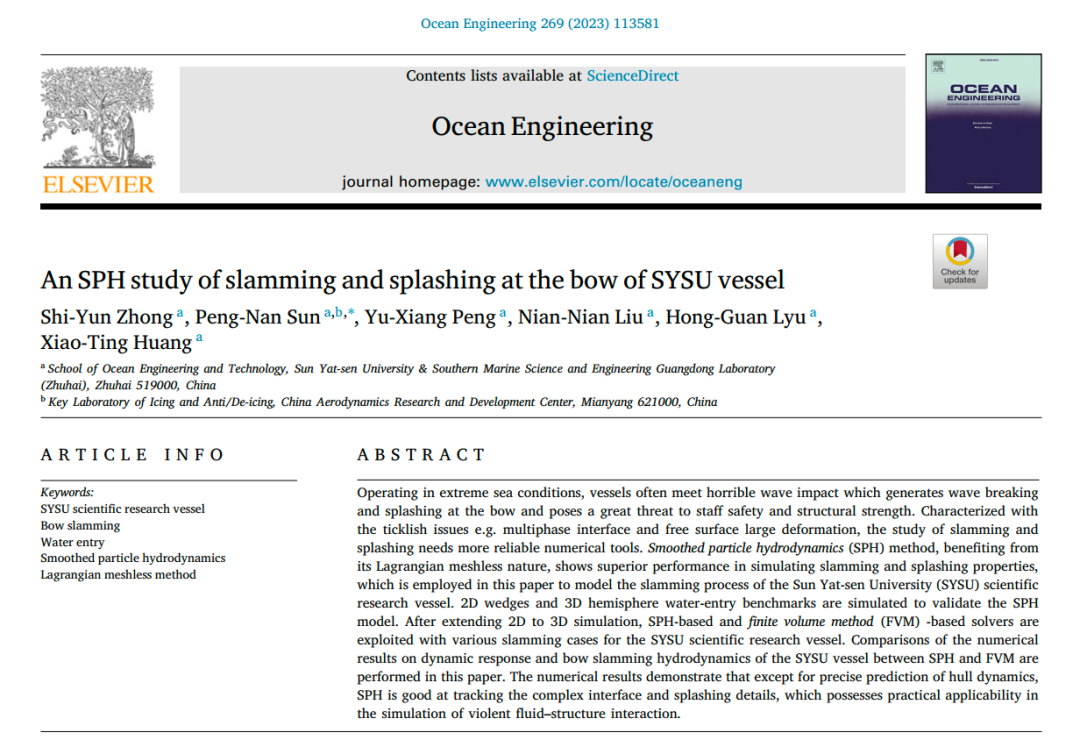 近日,我院师生围绕“中山大学” 号海洋综合科考实习船整船砰击动力学性能的研究成果在海洋工程国际权威顶刊《Ocean Engineering》发表。论文题目为“An SPH study of slamming and splashing at the bow of SYSU vessel”,2022级力学专业硕士研究生钟诗蕴等人在学院船海装备流固耦合研究团队孙鹏楠副教授的指导下,采用当前国际前沿的光滑粒子流体动力学(SPH)理论和计算方法,对“中山大学”号艏部砰击飞溅特征进行了系统研究。
