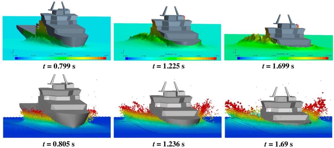 该论文采用了多级粒子分辨率-SPH模型,实现了对 “中山大学”号艏部砰击入水的液面大变形和液滴飞溅模拟。研究结果表明,SPH方法在运动响应预报结果与有限体积法(Finite Volume Method, FVM)计算结果吻合良好。在飞溅细节的捕捉方面,SPH能精准捕捉液滴喷溅细节,相较FVM更具备计算仿真优势,尤其适合用于计算复杂海况下船舶与波浪的流固耦合问题。本研究验证了SPH作为一种无网格数值计算方法在求解砰击飞溅问题的计算鲁棒性和数值精度。
