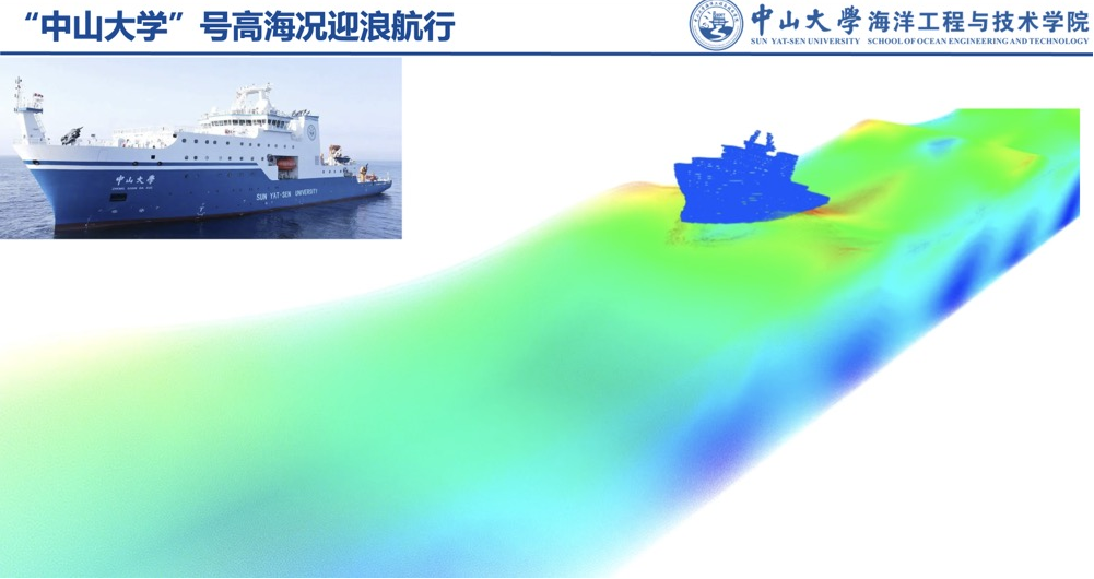 船舶在深远海复杂海况航行时,船体与波浪间强烈的流固耦合作用产生的砰击会对船体结构安全造成极大威胁,因此,能够精准预报船舶所受砰击载荷和航行姿态将为船舶与海洋工程装备设计研发提供有效参考。“中山大学”号海洋综合科考实习船作为我校的移动海上实验室和海上校园,具备强大的抗风浪性能等优点,其在抵抗波浪砰击和波浪飞溅的表现具有重大的研究意义。