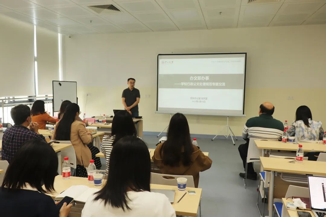 会上,刘天罡副主任作了题为《办文即办事——学校行政公文处理规范专题交流》的培训。他从认识公文、公文规范、公文写作、公文处理常见问题等4个方面深入详实地介绍了公文的定义、规范要求、写作技巧等内容,并结合自身工作经验和丰富的案例素材解析了公文处理工作中的常见问题,为大家提供了诸多解决思路和办法。培训主题鲜明、内容深入浅出,具有很强的指导意义和操作性。