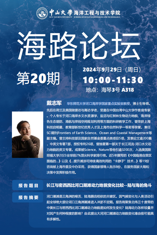第20期“海路论坛”将于9月29日(周日)10:00-11:30在海琴3号A318开展,邀请到华东师范大学河口海岸学国家重点实验室戴志军教授为师生作《长江与密西西比河口潮滩动力地貌变化比较--陆与海的角斗》主题报告。