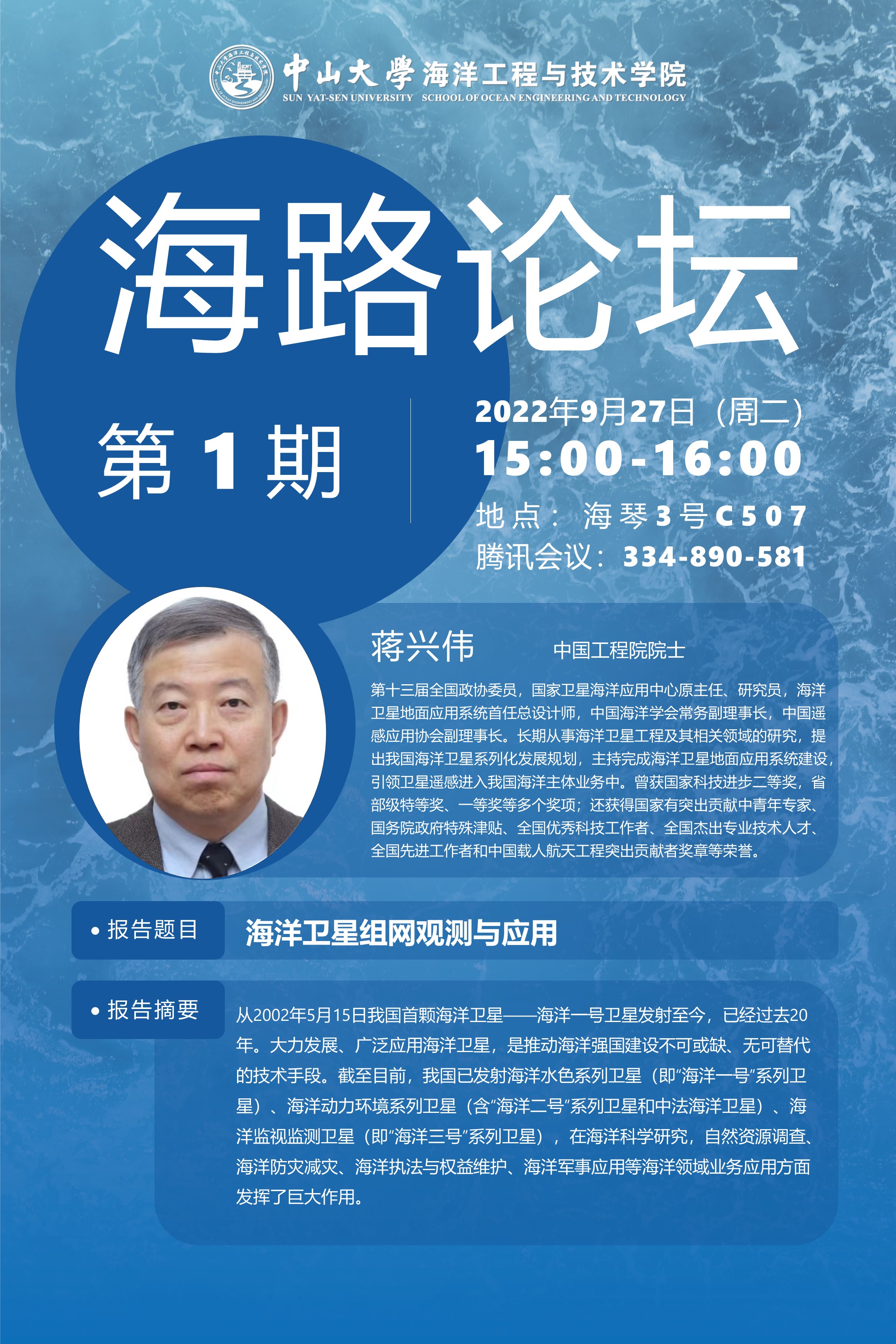 海路论坛第1期将于2022年9月27日(周二)下午15:00-16:00于珠海校区海琴3号C507举办,由中国工程院院士蒋兴伟作《海洋卫星组网观测与应用》主题讲座。