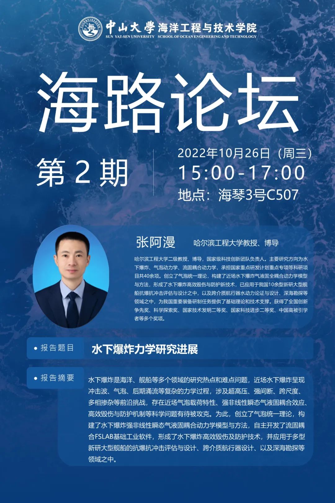 第2期“海路论坛”将于2022年10月26日(周三)下午15:00,在中山大学珠海校区海琴3号C507开展,邀请哈尔滨工程大学张阿漫教授为师生作《水下爆炸力学研究进展》主题报告。