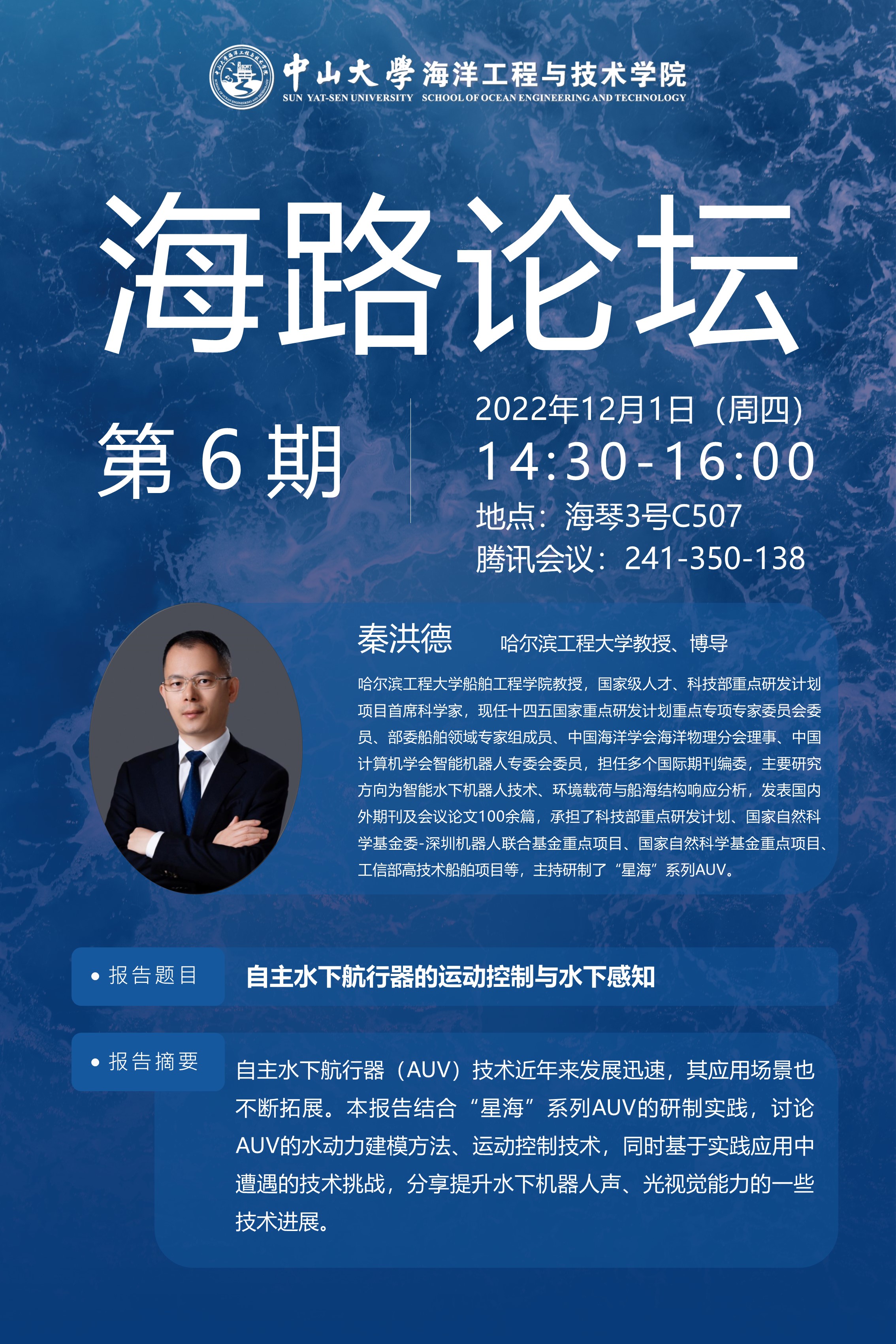 第6期“海路论坛”将于2022年12月1日(周四)下午14:30,在中山大学珠海校区海琴3号C507开展,邀请了哈尔滨工程大学秦洪德教授为师生作《自主水下航行器的运动控制与水下感知》主题报告。