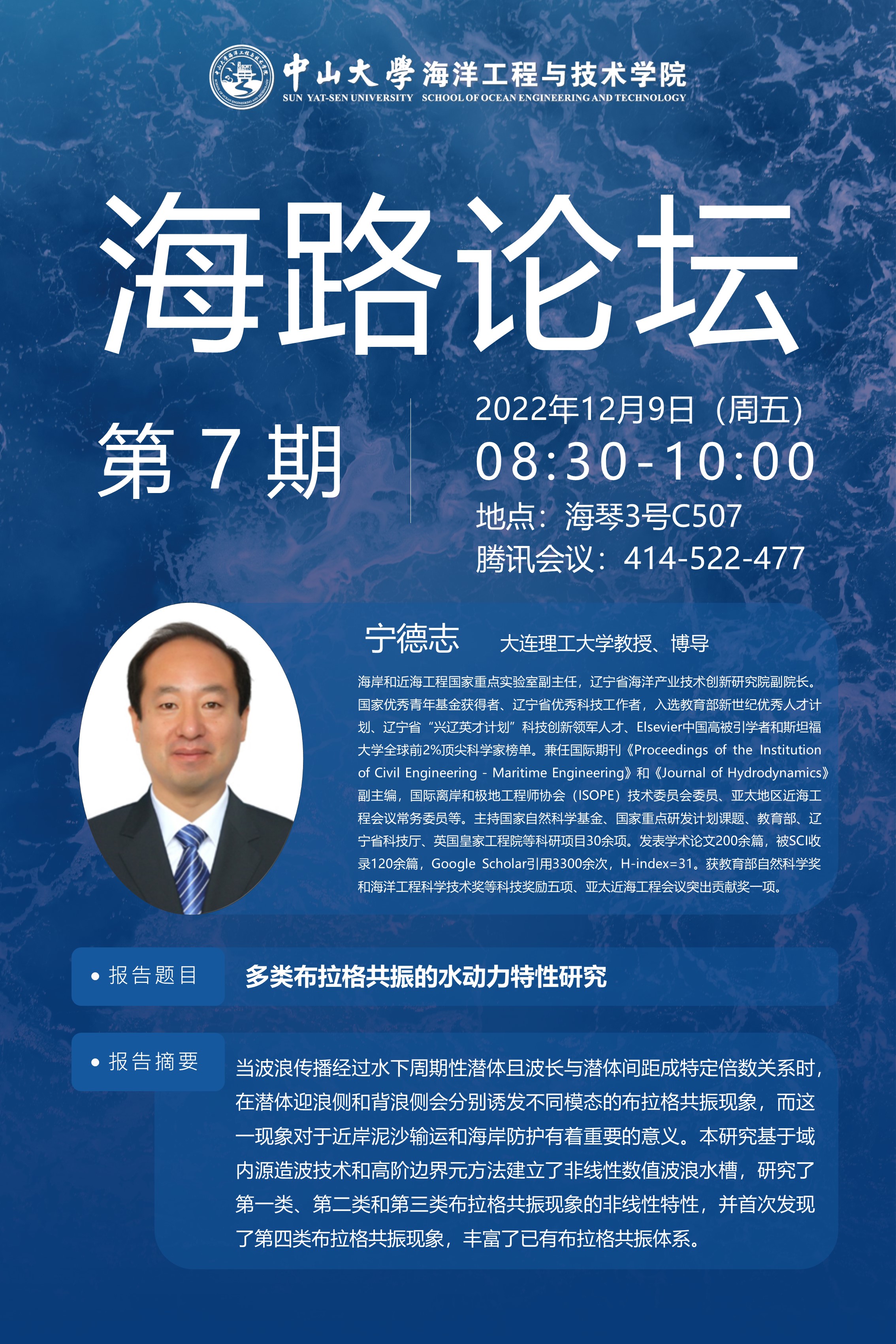 第7期“海路论坛”将于2022年12月9日(周五)上午8:30,在中山大学珠海校区海琴3号C507开展,邀请了大连理工大学宁德志教授为师生作《多类布拉格共振的水动力特性研究》主题报告。