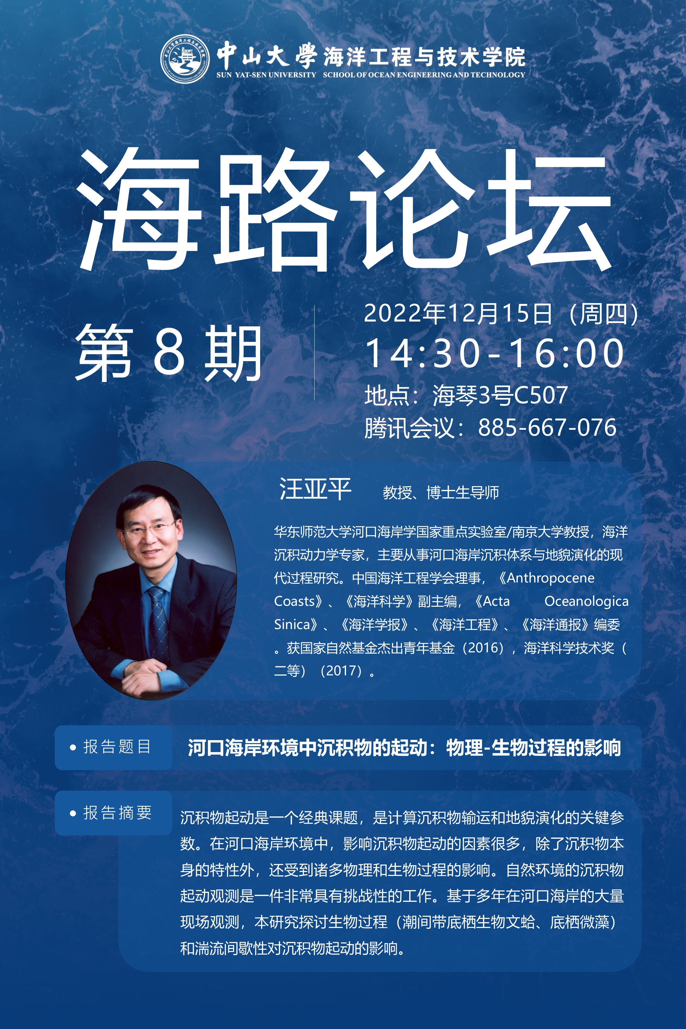 第8期“海路论坛”将于2022年12月15日(周四)下午14:30,在中山大学珠海校区海琴3号C507开展,邀请了华东师范大学汪亚平教授为师生作《河口海岸环境中沉积物的起动:物理-生物过程的影响》主题报告。