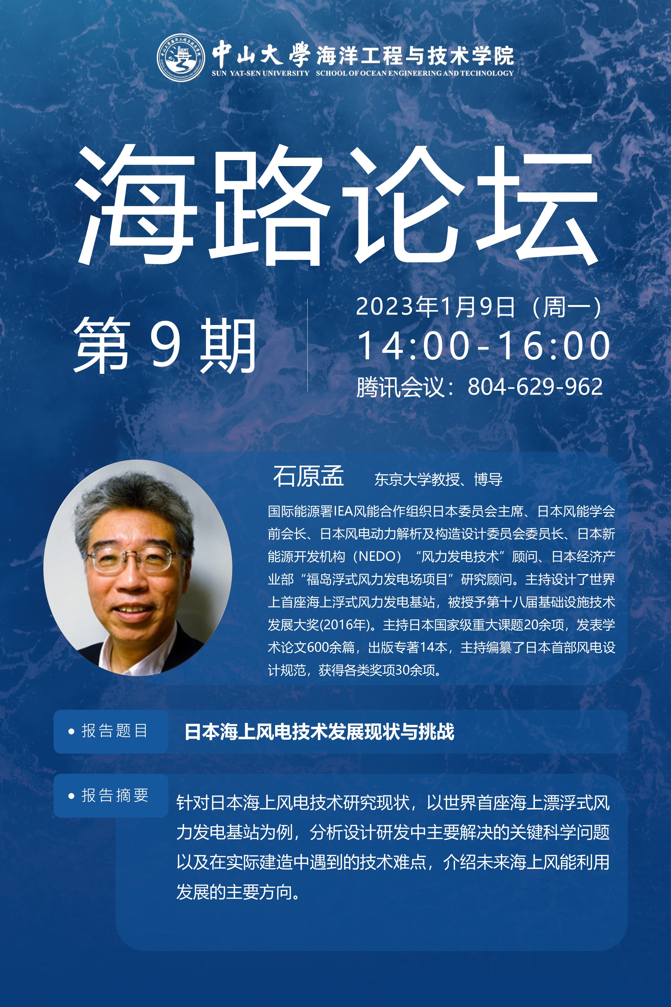 第9期“海路论坛”将于2023年1月9日(周一)下午14:00,以线上形式开展(腾讯会议:804-629-962),邀请了东京大学石原孟教授为师生作《日本海上风电技术发展现状与挑战》主题报告。